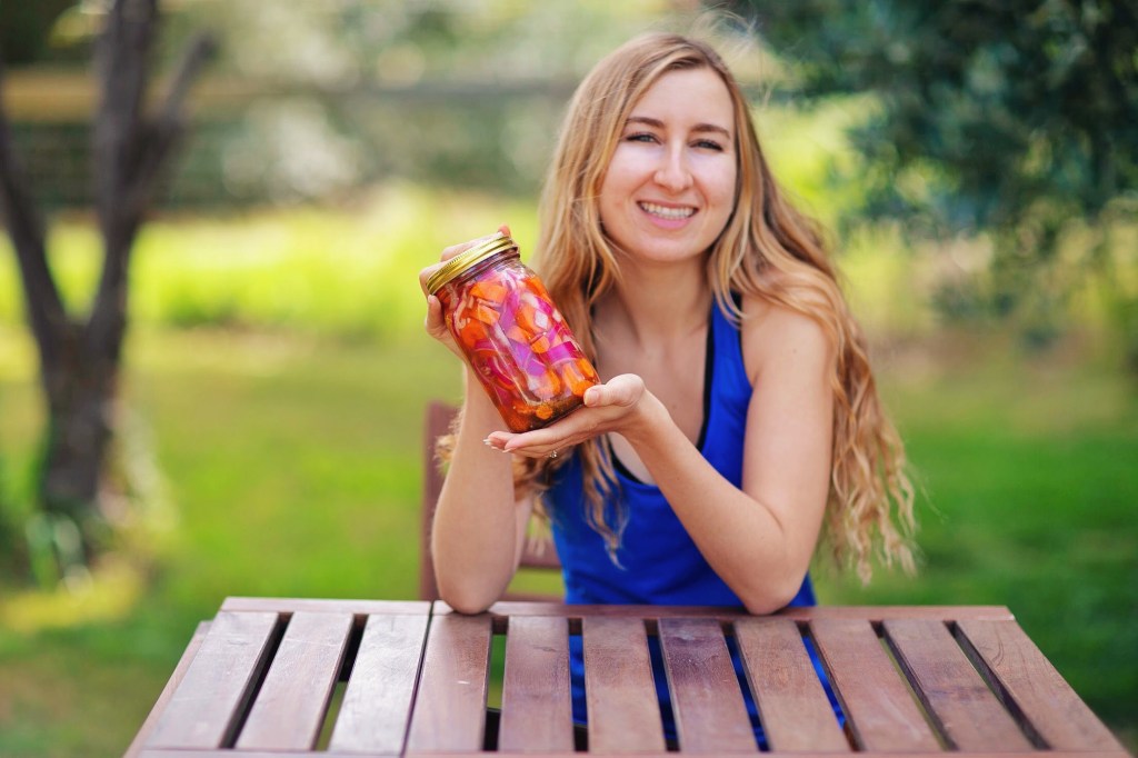 - Layer your chopped veggies into a jar. I suggest using a jar with a plastic lid, because the vinegar makes metal lids rust quickly. (You could also put clingwrap over the jar before putting the metal lid on)