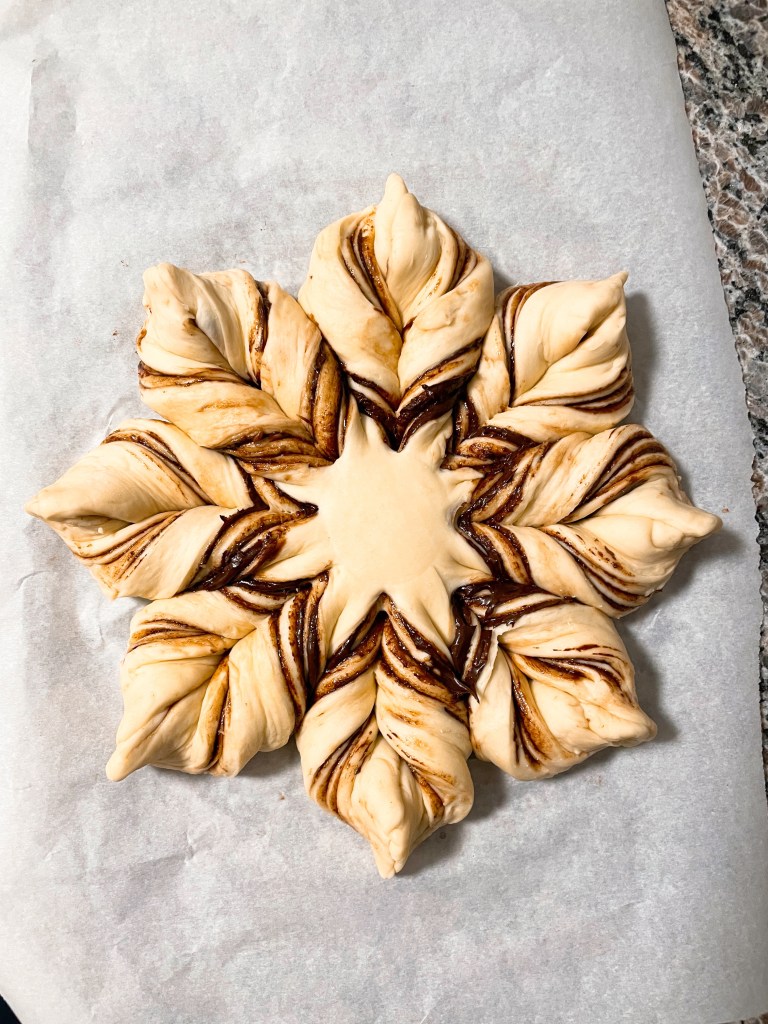 (I strongly recommend watching a video like this one before starting this step.) Use a 2-3″ circular pastry cutter, glass, or jar to lightly mark a circle in the center of the dough; do not cut the dough out. Then slice the surrounding dough like a pizza into 16 equal pieces, leaving the center circle uncut.